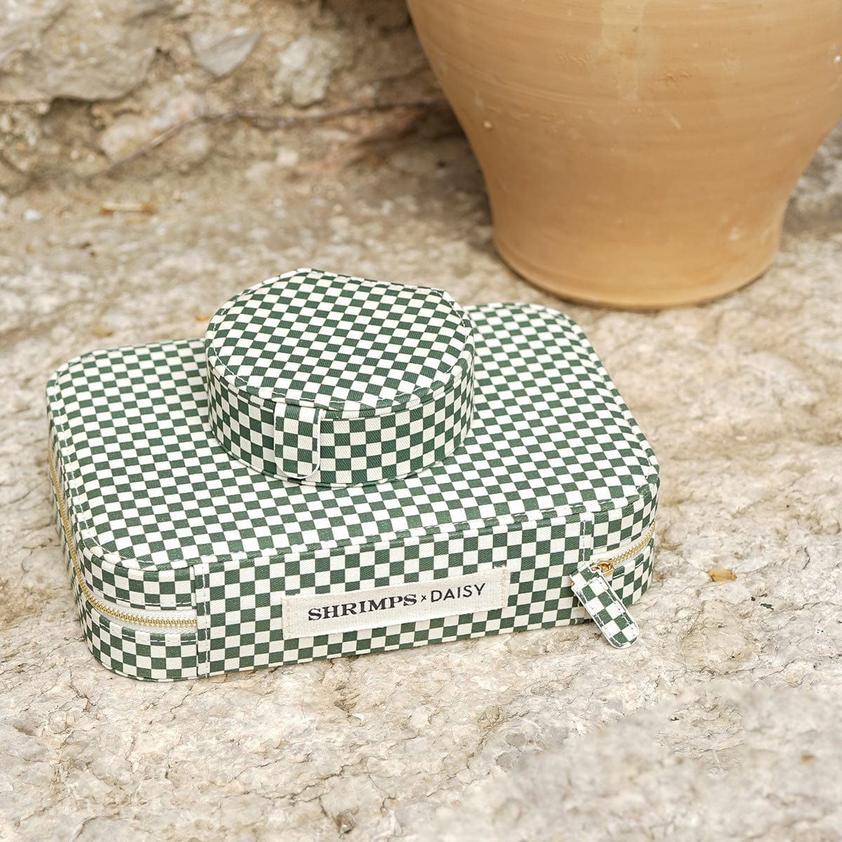 Limited edition Shrimps x Daisy jewellery case featuring a standout checkerboard print with a rich green centre. Spacious and stylish, it has dedicated sections for necklaces, rings, hoop earrings, bracelets, and studs. Size: 240 x 170 x 55mm.