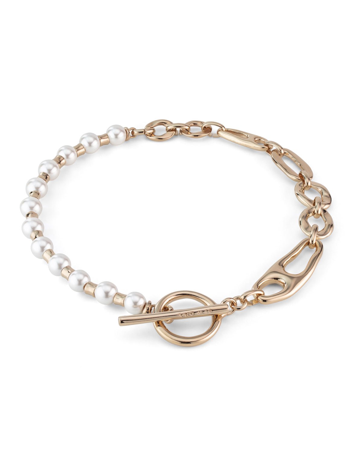 Material: 18k gold plated metal alloy necklace with a combination of links, pearls and ring and bar clasp