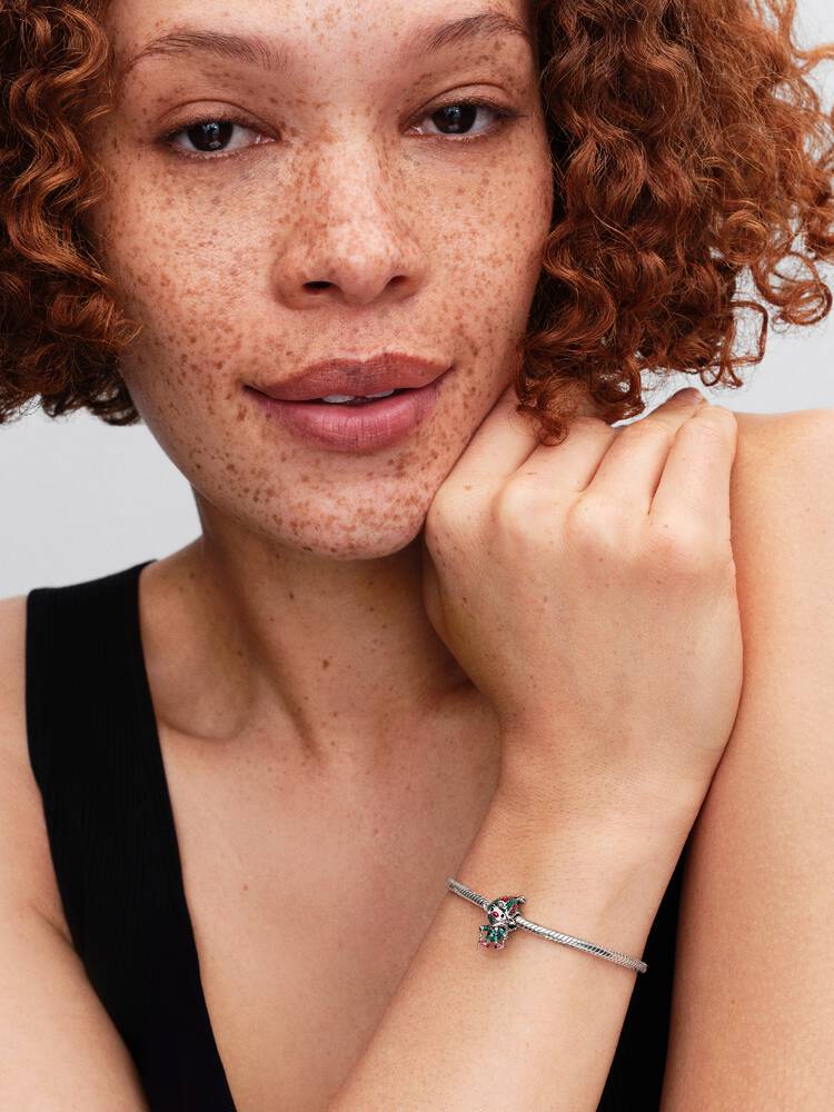 Bring a sprinkle of holiday fun to your collection with the Pandora Moveable Elf Charm. Crafted in sterling silver and hand-painted with glittery red, green, black, and pink enamel, this charming little elf is full of festive cheer. Its moveable design adds playful motion, making it a magical reminder of the joy and mischief of the season.