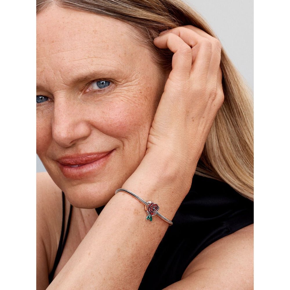 Designed to capture the delicate nature of the flower, this charm features a layered petal effect and is covered with red man-made crystals. Two green stones dangle beneath the flower representing leaves. ...