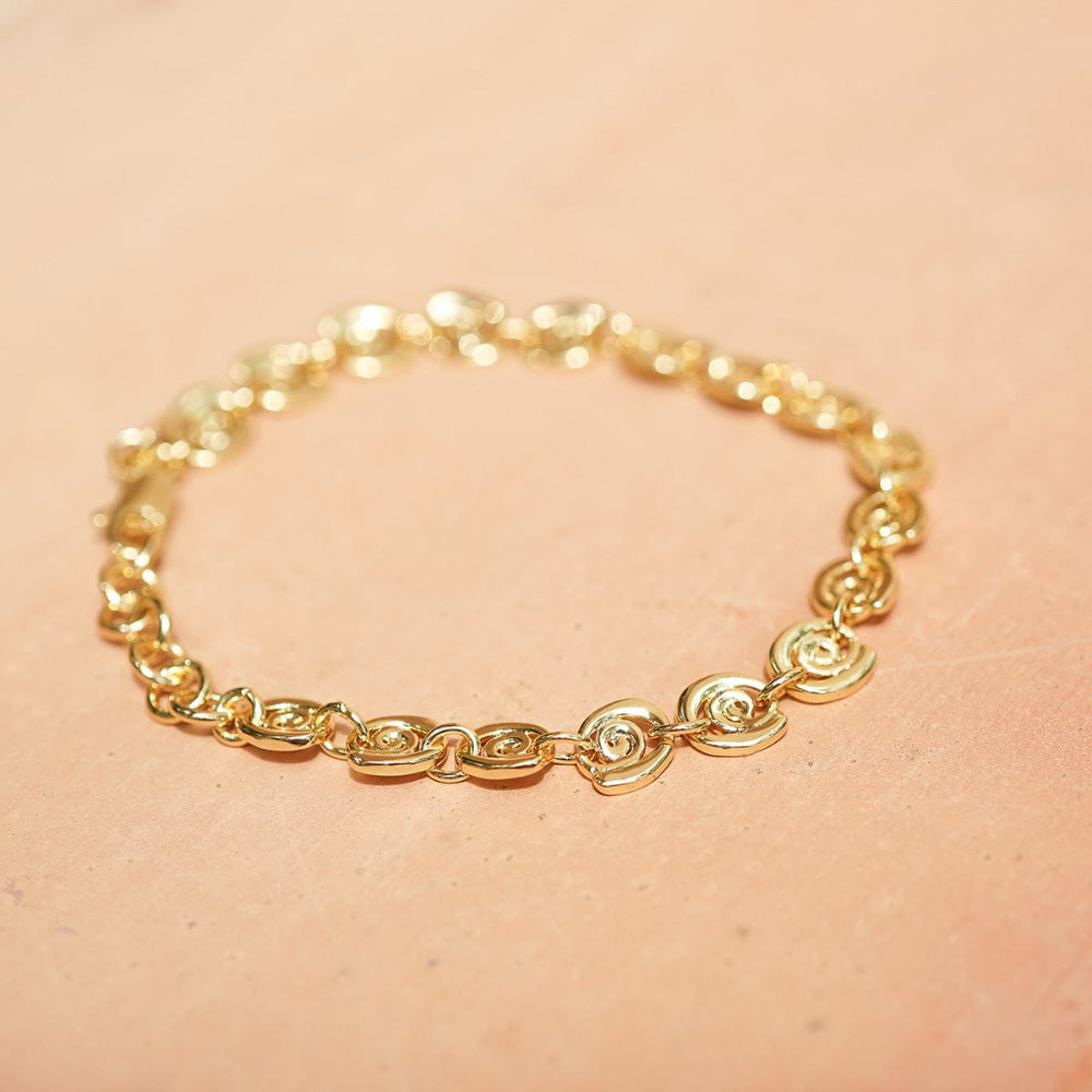 Twist and shine. This bracelet is all flowing form and subtle texture, with spiralling links that catch the light just right. Made to move with you. Made from recycled brass and 18ct gold plate.