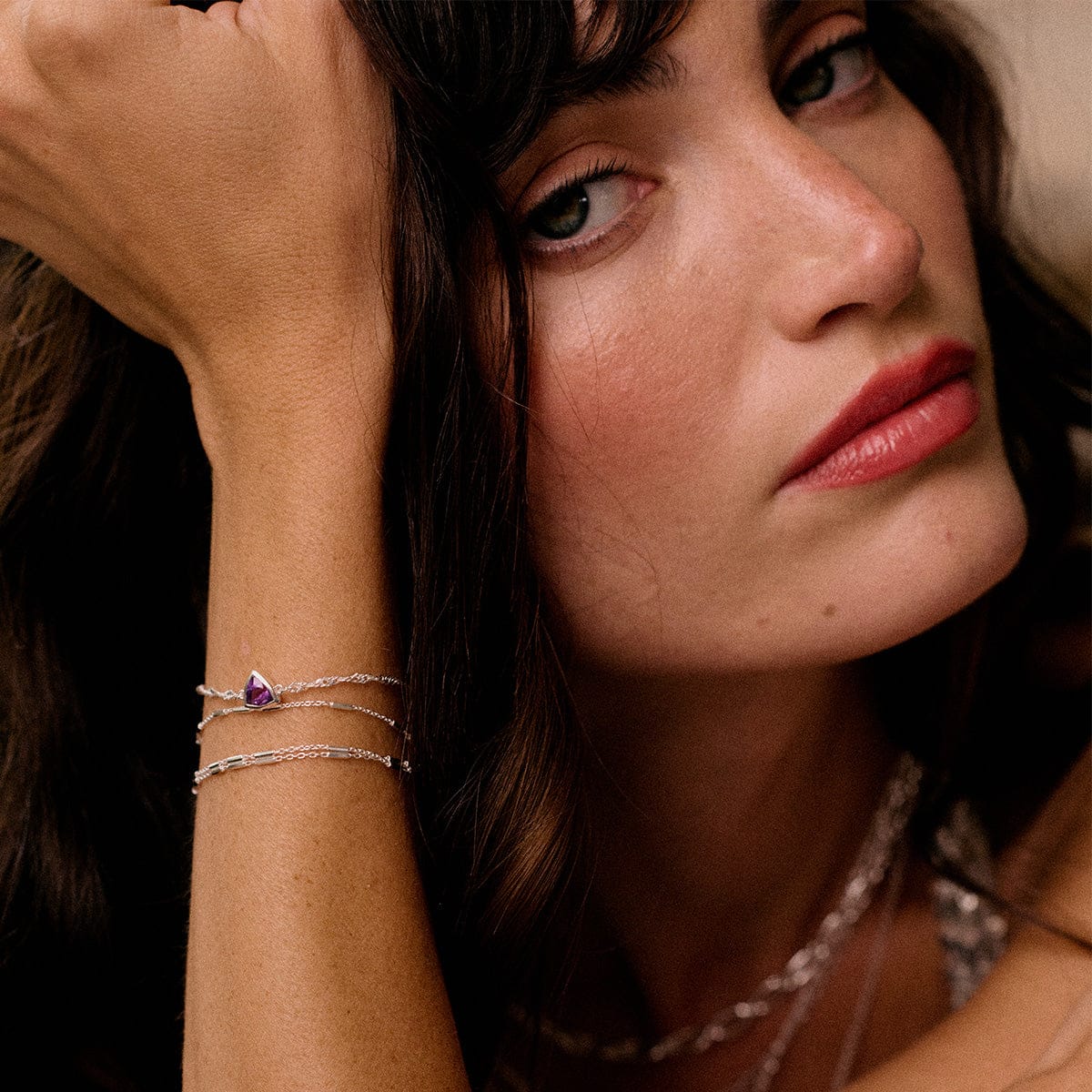 Adorn your wrist with a touch of personal magic with our delightful sterling silver birthstone charm bracelet. Each unique gemstone carries its own special energy, offering a beautiful symbol of strength, love, or luck. Crafted from 100% recycled silver, this bracelet is a thoughtful keepsake, perfect for gifting or treating yourself. Discover the enchanting allure of your birth month's gem.