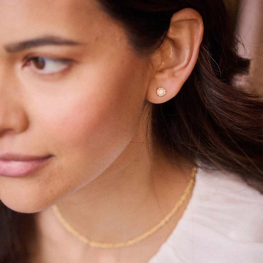 A little sparkle goes a long way. Made from 100% recycled sterling silver and 18ct gold plate with a Cubic Zirconia stone at the centre, these small but radiant studs bring an easy glow to every moment.