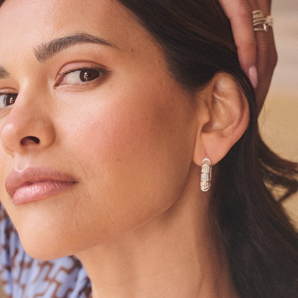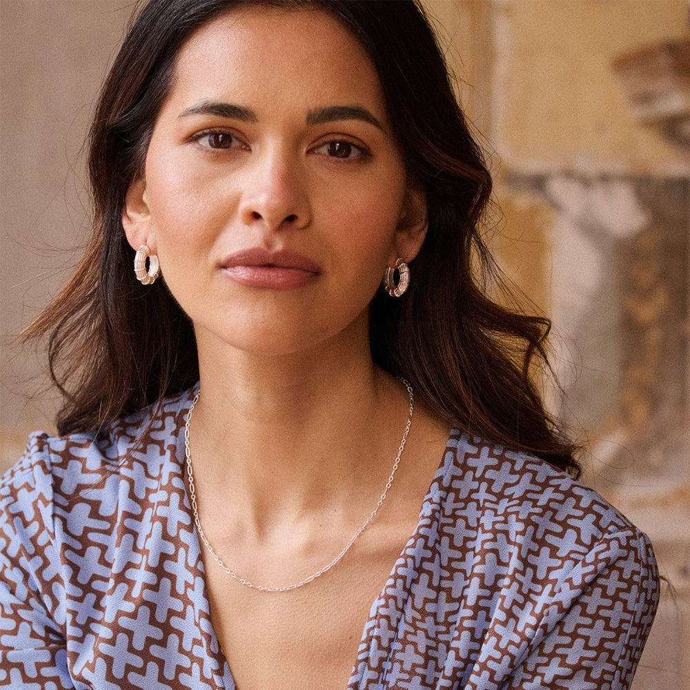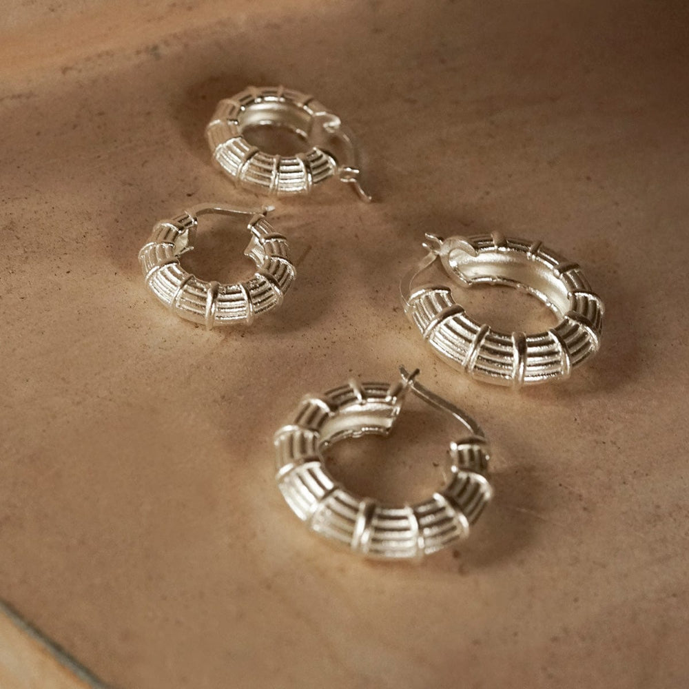Designed to turn heads from sunrise to sunset, the Apollo Large Hoops are your statement-makers. Stacked with studs or worn alone, they radiate confidence with every wear. Made from recycled brass and 100% recycled sterling silver plate.