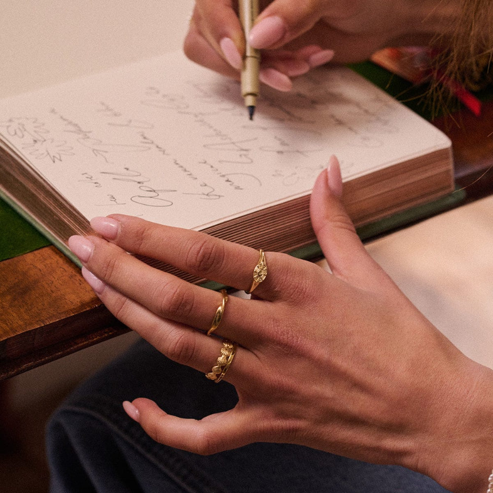 Our signature Daisy gold is 18ct gold plate on recycled sterling silver, with a thickness that is far above industry standards to ensure your pieces last.