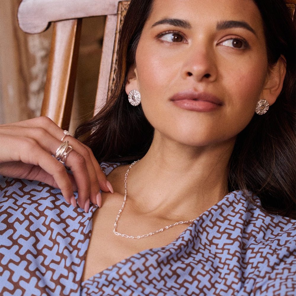 Our signature Daisy silver is recycled sterling silver plate on brass. Made of a minimum of 92.5% solid silver and from 100% recycled materials.