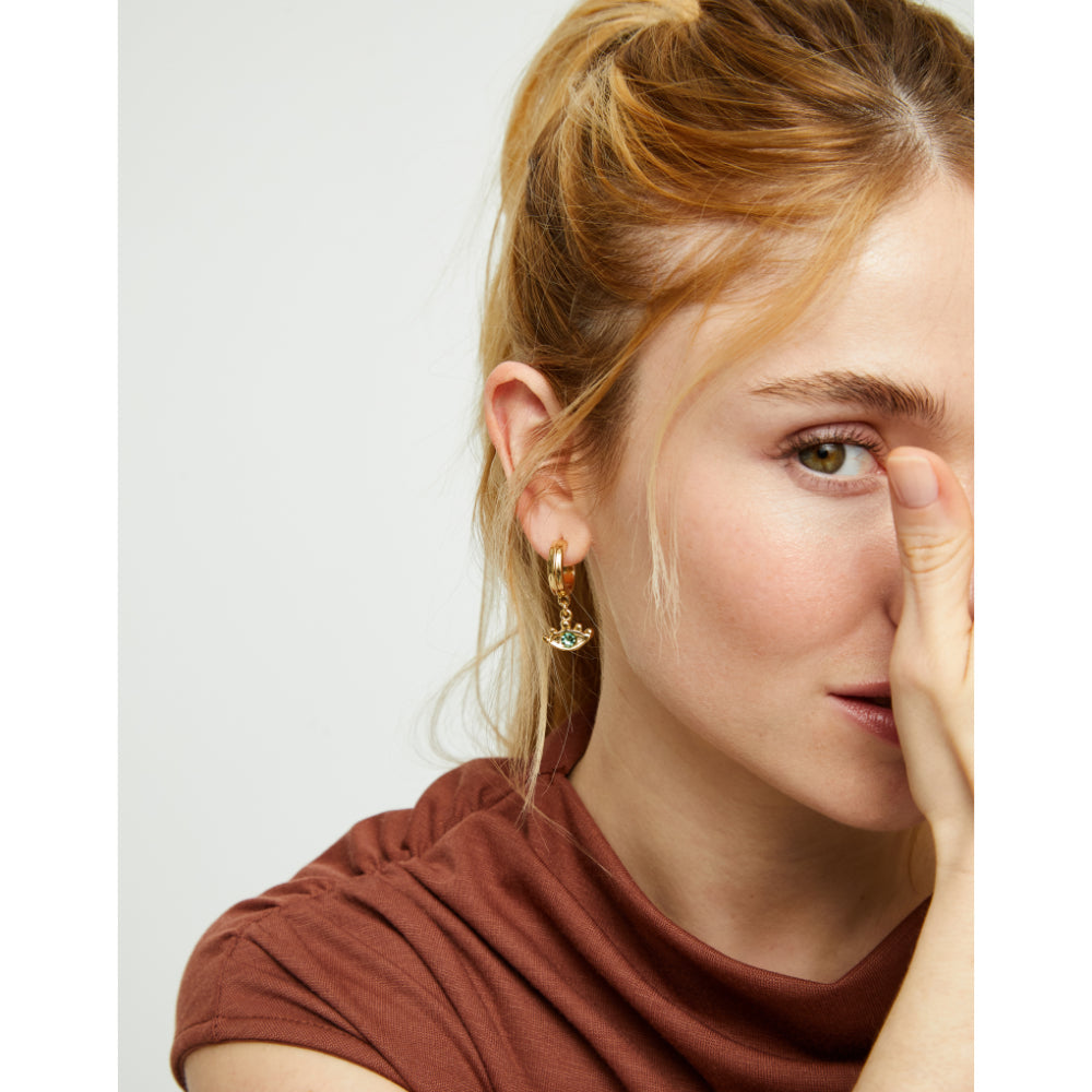 Gold hoop eye-shaped earrings with green faceted crystal. There are people who are visionary, whose intuition is their compass. Ser intuitiva takes into consideration that mystical side of us, allowing us to bring out our hidden self and show it to the world.