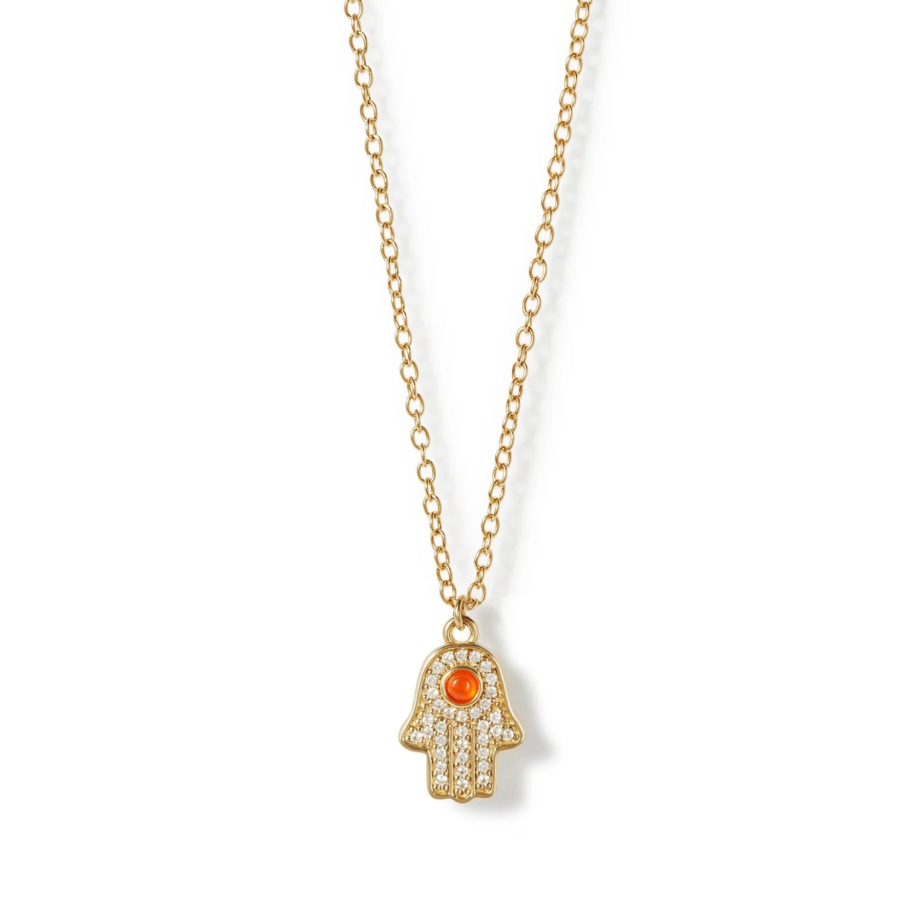 The Hamsa Hand is accented with sparkling Created Sapphires and a single Carnelian gemstone.