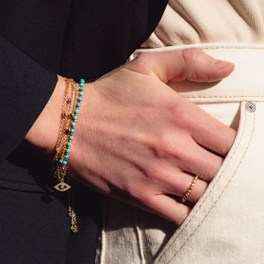 A captivating sapphire Evil Eye charm finishes the design, providing powerful protection and style. The turquoise gemstones create a relaxed, luxurious aesthetic that is perfect for summer stacking.