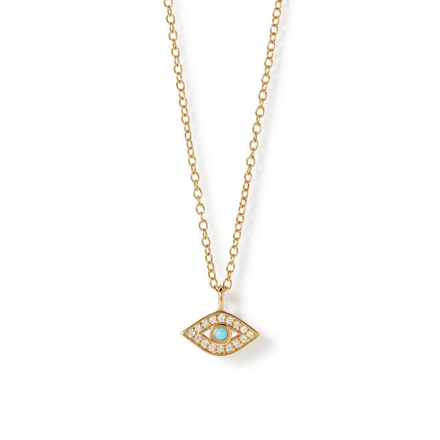 Ward off bad energy in style with this elegant pendant from our Biography Motifs collection. This necklace features the iconic Evil Eye symbol with a vibrant turquoise pupil and dazzling cultured white sapphire gemstone pavé.