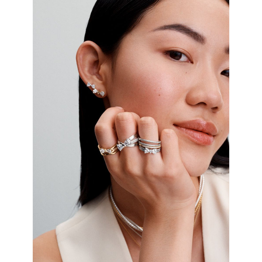 This eye-catching ring features a contemporary bow motif surrounded by cubic zirconia, accented by a double row of pave stones. Perfect for adding a touch of shine to any outfit.