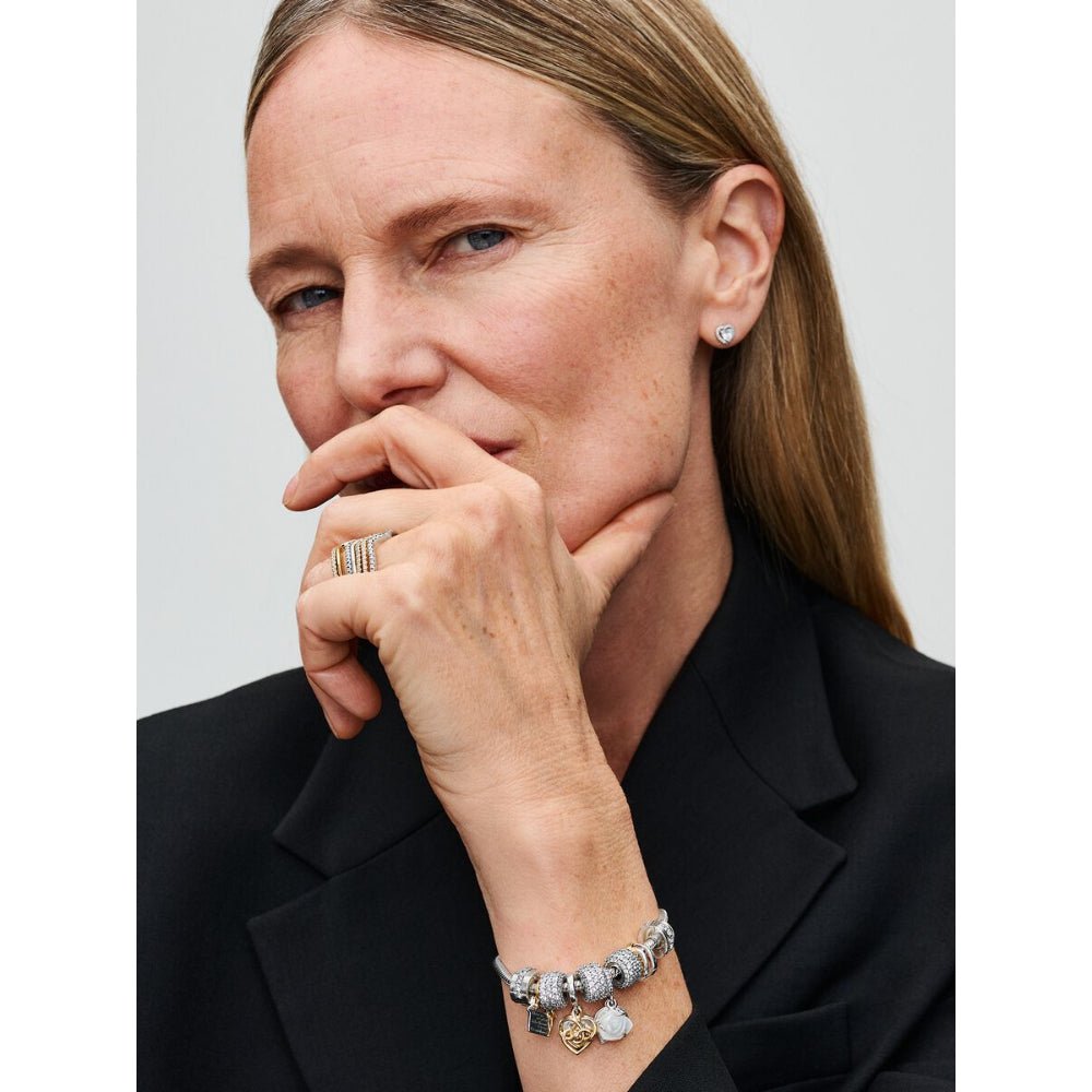 A romantic version of Pandora's bestselling bracelet. Hand-finished with a heart-shaped clasp, this sterling silver snake chain bracelet makes a sleek statement on its own - or adorned with your favourite charms.