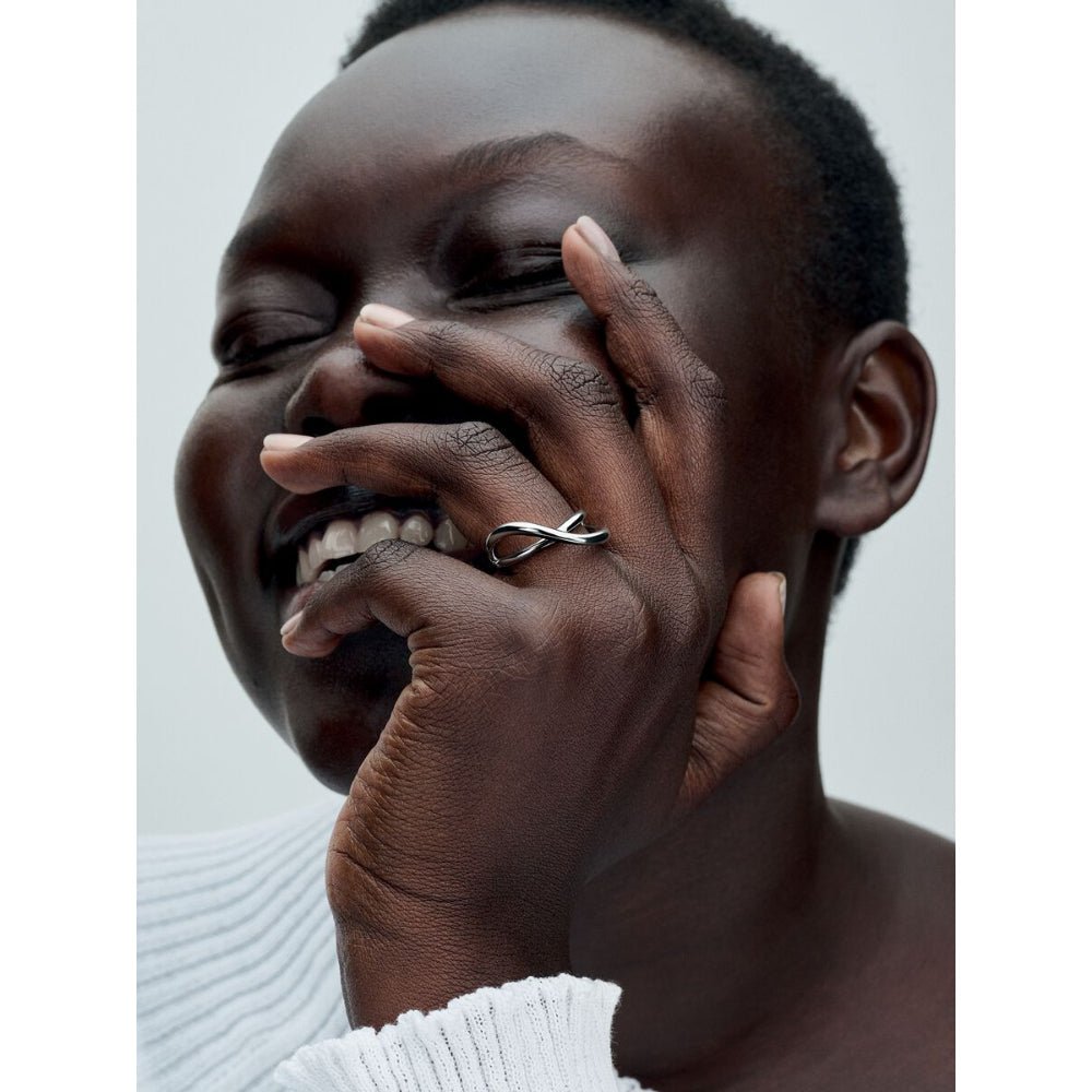 Bring subtle dimension to your look. The sterling silver ring splits in two overlapping bands which are connected at the back and evoke an infinity sign. Soft, organic shapes embody the beauty in nature, bringing an architectural element to any look.