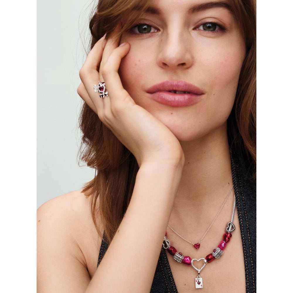 Love at first sight. Two deep red man-made crystal hearts are set in a pave embrace on each side of this sterling silver charm. Add a touch of elegance to your collection with a sparkling heart.