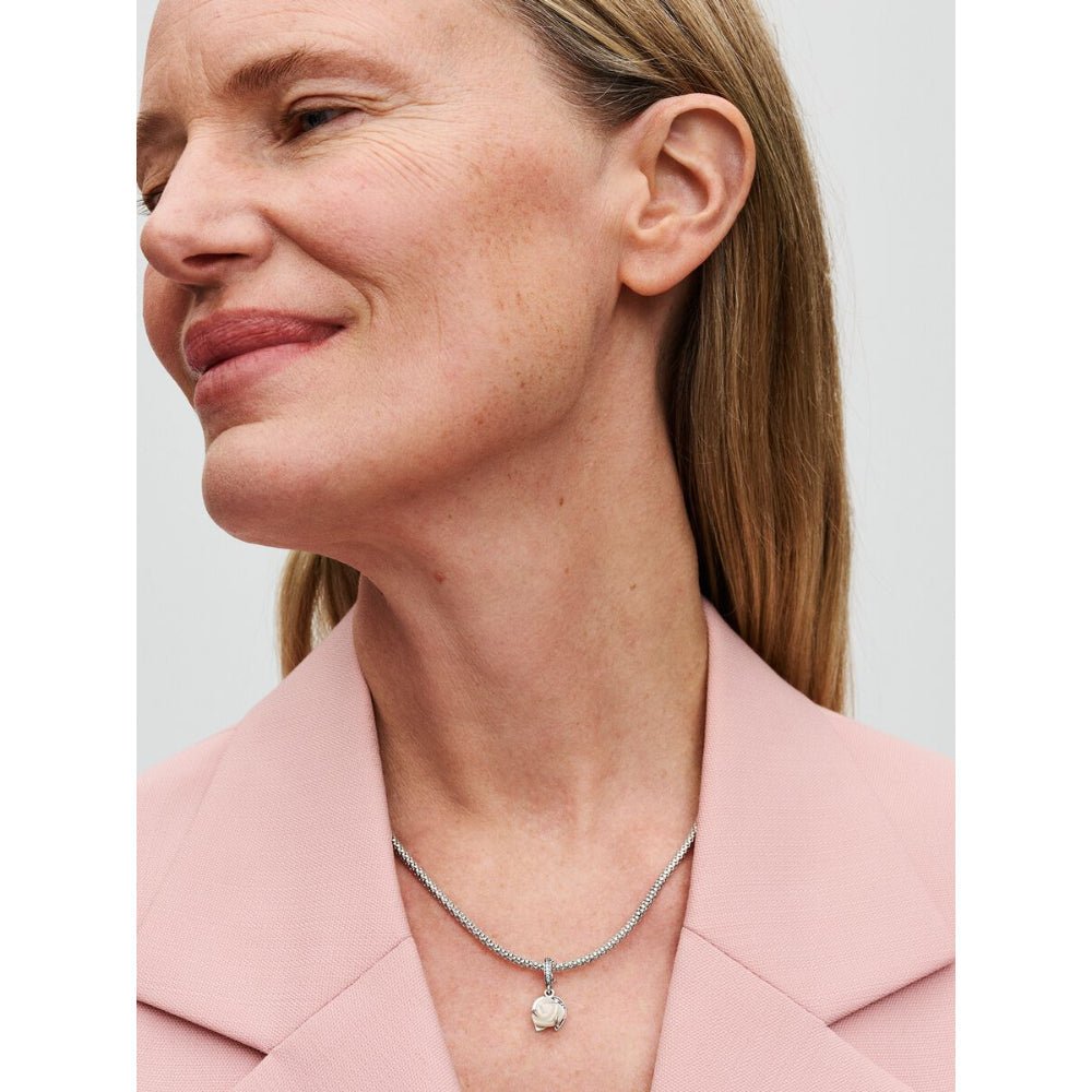 Embrace timeless elegance. In this dangle charm, white Bio resin man-made Mother of Pearl unfolds into a blooming rose, symbolising love. Asymmetric leaves and brilliant cubic zirconia embellish the charm, while a "NOTHING COMPARES TO YOU" engraving adds a personal touch.
