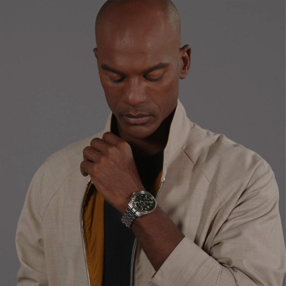 A multifunctional design inspired by the spirit of aviation, this BOSS Menswear watch combines silver, green and gold tones for modern elegance.