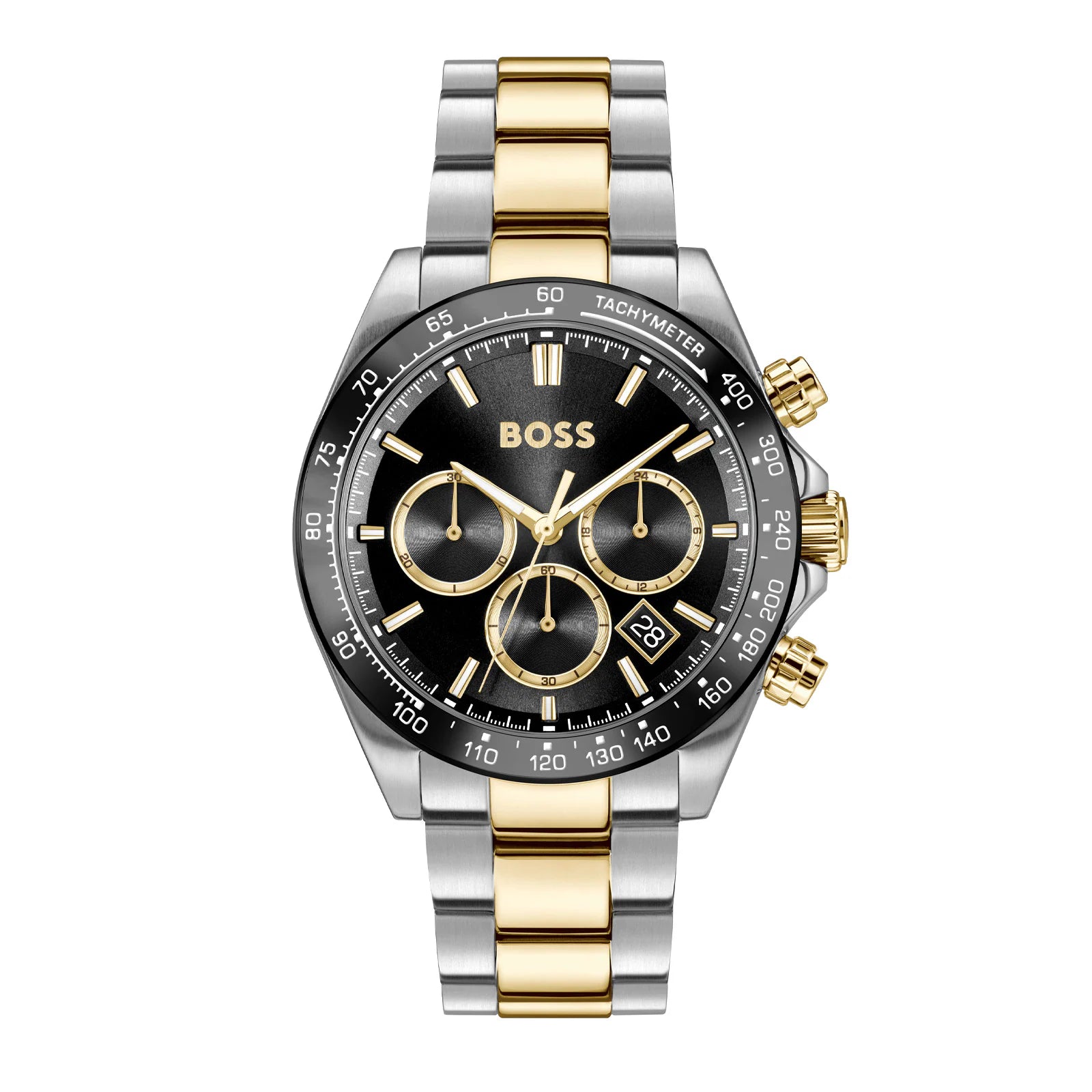 Gents Boss chronograph with date window from the Hero family. Featuring a 43mm stainless steel case with black IP bezel, black dial with date window, stainless steel and light yellow gold IP three link bracelet. Water resistant to 5ATM.