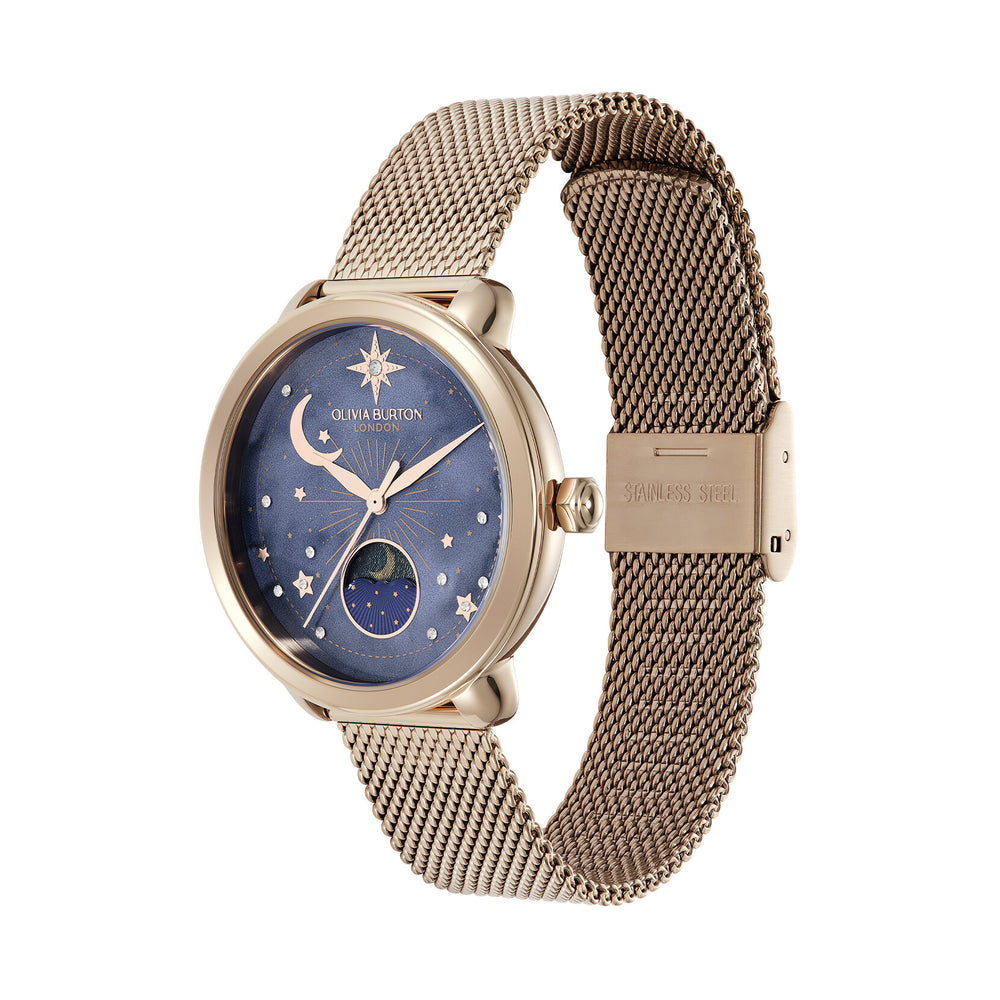 Olivia Burton Celestial 34mm Moon Phase Navy & Rose Gold Mesh Watch