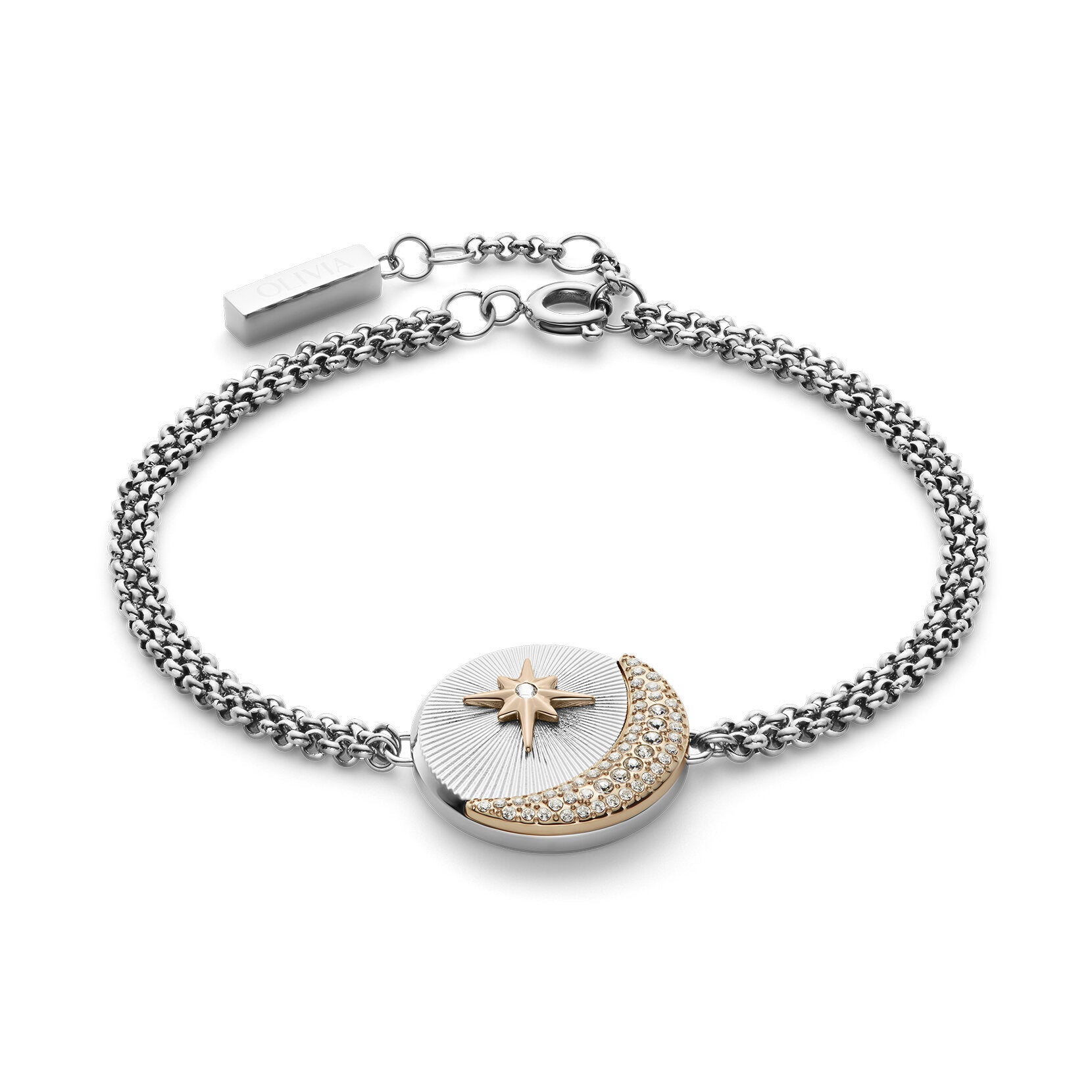 Olivia Burton ladies bracelet from the Signature Celestial Collection. This celestial-inspired double-layered bracelet features a silver-tone disc pendant with a radiant sunburst texture, a crescent moon adorned with delicate pavé crystals, and a rose gold North Star symbolising guidance and wisdom. Finished in a two-tone silver and rose combination, this elegant bracelet is the perfect companion to the Celestial Star and Moon Necklace.