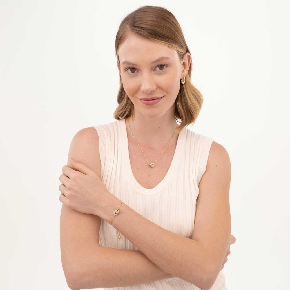 Boss ladies necklace from the Live Precious collection. Featuring a light gold IP chain with intertwined rings with crystal pave setting. Length 457 mm with 50 mm extender. Pendant width 22mm.