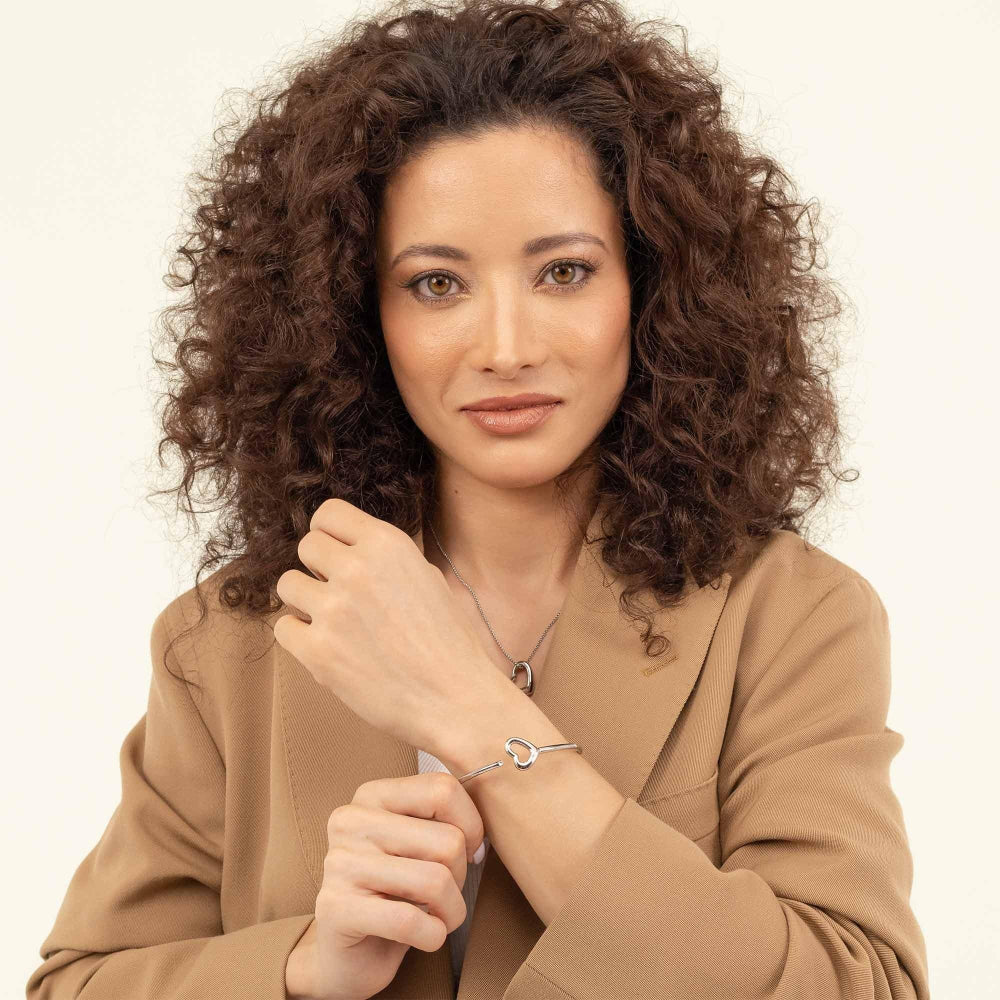 Boss ladies bangle from the Honey Boundless collection. Featuring a stainless steel bangle threaded with a open heart pendant with crystals. Length 50 mm x 59 mm with 3 mm width x 17 mm heart