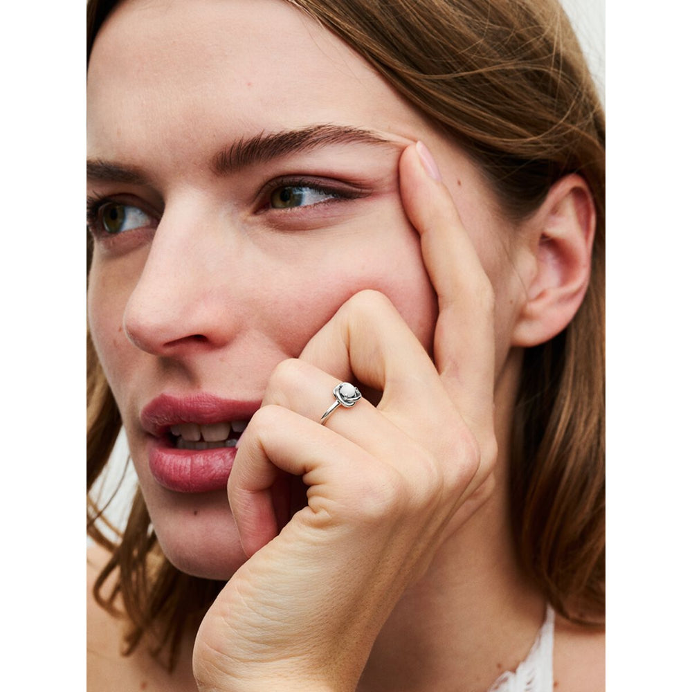 Wear a symbol of forever. Featuring a claw-set, Bio resin man-made mother-of-pearl, the polished band of this eternity ring wraps around the stone to form a braided infinity pattern. A wearable reminder of eternal love or a symbol of timeless joy.