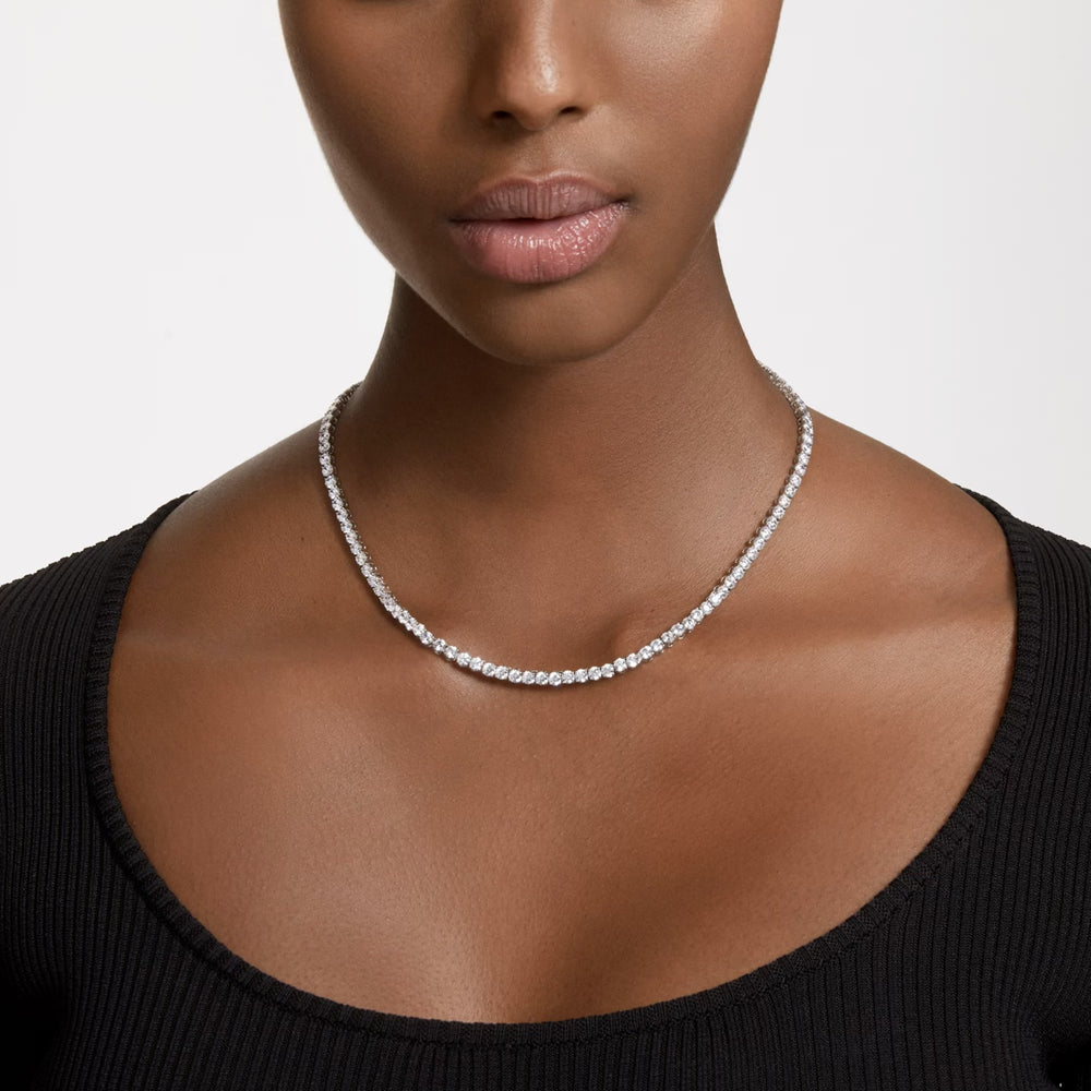 Indulge in the perfect blend of modern sophistication and classic charm with the Swarovski Silver Matrix Tennis Necklace. Elevate your everyday look with this exquisite piece that exudes purity and elegance through shimmering clear stones set in a rhodium-plated design.