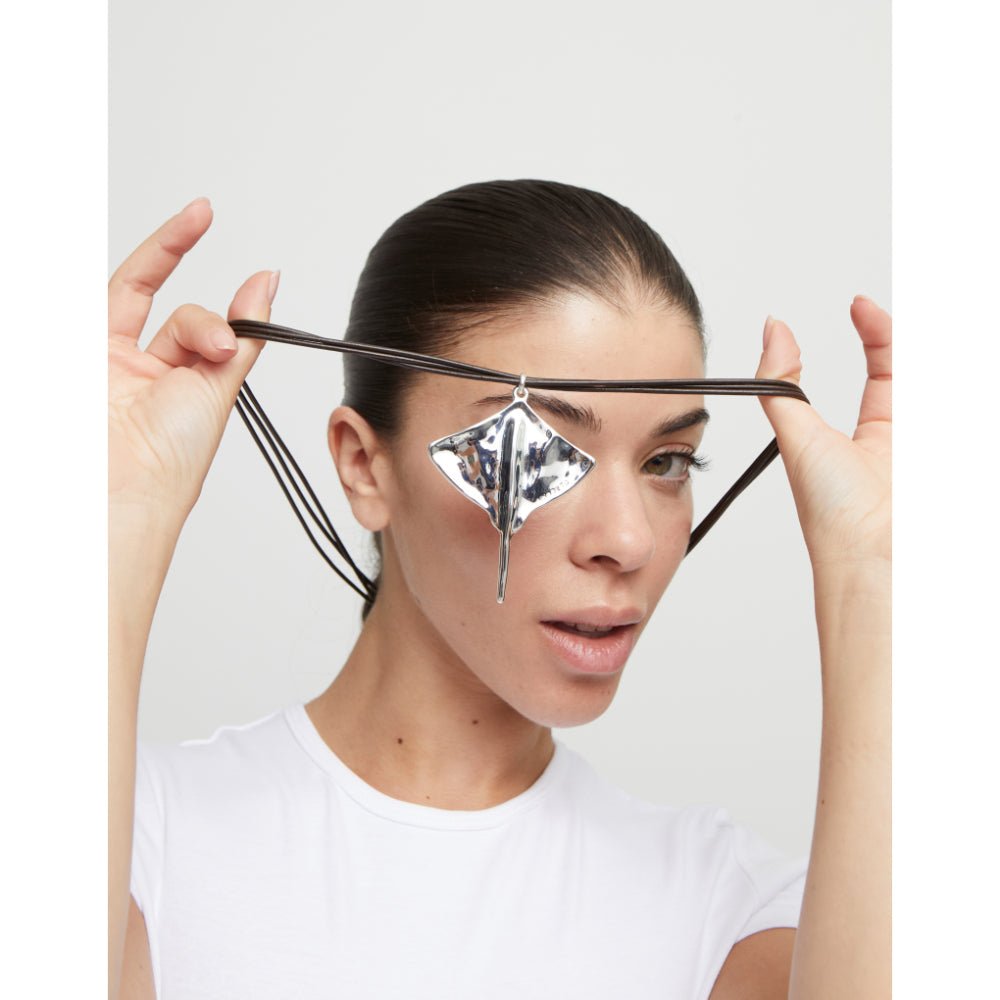 Sterling silver-plated pendant with long leather chain and a manta ray. Get the collection Ser Majestuosa with its elegant and organic pieces that evoke the dance of the manta ray across the sea.